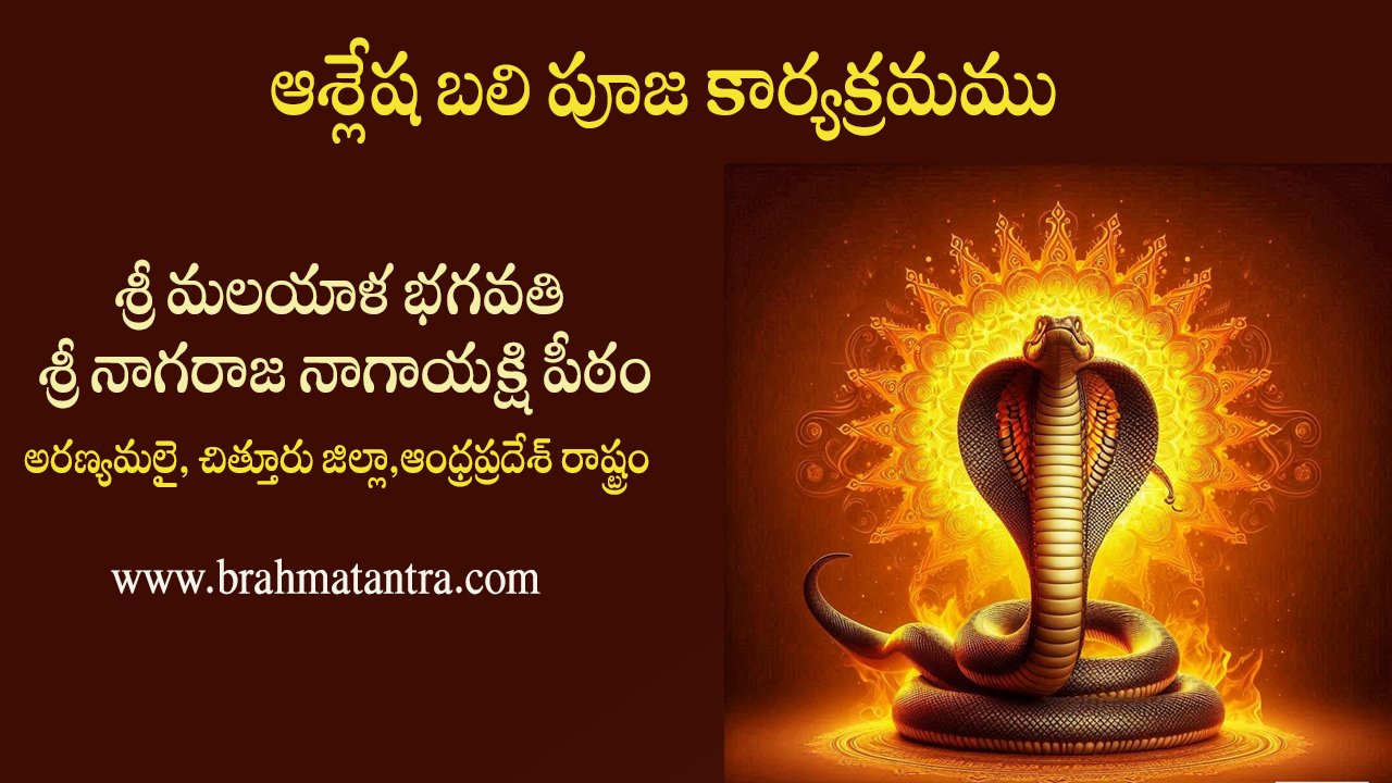 ఈ ఆశ్లేషబలి పూజా కార్యక్రమంలో జాతకుడు నాగ దేవతల యొక్క అనుగ్రహమును, సుబ్రహ్మణ్యేశ్వర స్వామి యొక్క అనుగ్రహమును పొందేలా కొన్ని ప్రత్యేకమైన ప్రక్రియలు నిర్వహిస్తారు. 84 నాగ దేవతలకు పిండ ప్రధానమును, తర్పణమును ఆచరిస్తారు. ఈ ఆశ్లేషబలి పూజా ప్రక్రియను ఆంధ్రప్రదేశ్ రాష్ట్రంలోని, చిత్తూరు జిల్లాలోని అరణ్యమలై నందు మలాయల భగవతి శ్రీ నాగరాజ నాగాయక్షి పీఠము నందు కేరళ నంబూద్రీలు, నాగ వంశీకుల ఆధ్వర్యంలో శక్తివంతంగా, దిగ్విజయంగా జరిపించడం జరుగుతోంది. ఈ వీడీయో వీక్షించి మరిన్ని వివరాలు తెలుసుకోగలరు.
